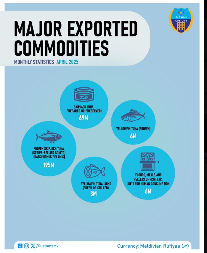 ކަސްޓަމްސްއިން އާންމުކޮށްފައިވާ އޭޕްރީލް މަހުގެ ތަފާސްހިސާބުތަކުގައިވާ ގޮތުން މިދިޔަ މަހު ރާއްޖެއިން އެންމެ ގިނައިން ބޭރުކުރީ ފިނިކުރި ކަނޑުމަހެވެ. އެއީ 195 މިލިޔަން ރުފިޔާގެ ފިނިކުރި ކަޅުބިލަ މަހެވެ. ދެވަނައަށް އެންމެގިނައިން ބޭރުކުރީ ދަޅުމަހެވެ. މިދިޔަ މަހު 69 މިލިޔަން ރުފިޔާގެ ދަޅުމަސް ބޭރުކުރިއެވެ. ދަޅުމަސް އުފައްދަނީވެސް ކަޅުބިލަ މަހުންނެވެ. 3 ވަނައަށް އެންމެ ގިނައިން ބޭރުކުރީ ފިނިކުރި ބޮޑު ކަންނެއްޔެވެ، 6 މިލިޔަން ރުފިޔާގެ ކަނޑުކުރި ބޮޑުކަންނެލި ބޭރުކުރިއިރު 3 މިލިޔަން ރުފިޔާގެ ތާޒާ ބޮޑުކަންނެލި ބޭރުކުރިއެވެ.