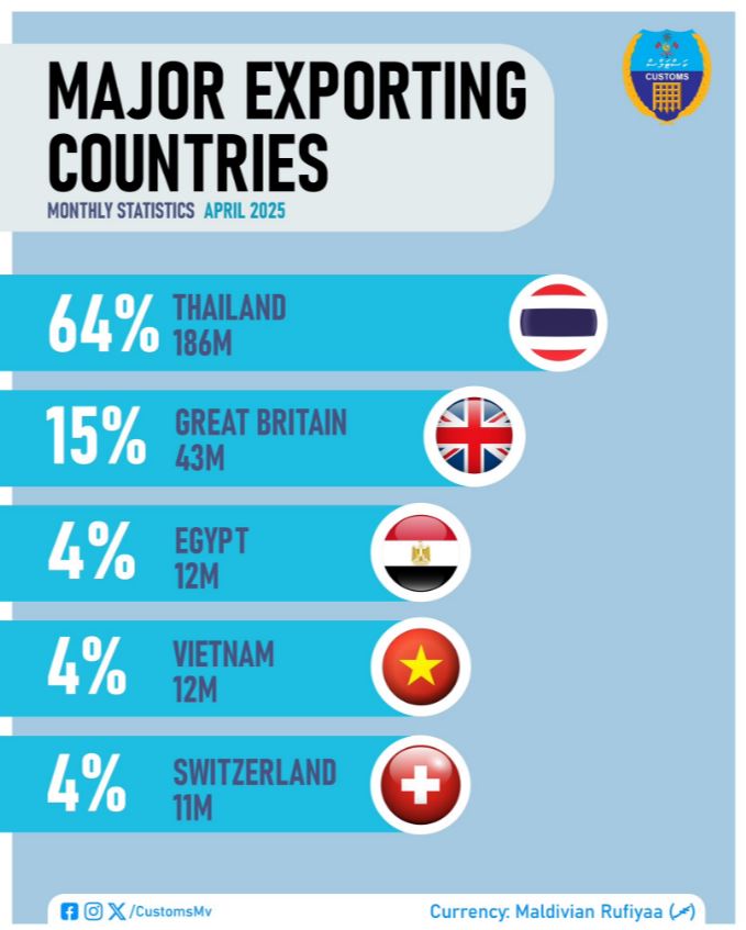މިދިޔަ މަހު ރާއްޖެއިން އެންމެ ގިނައިން އެކްސްޕޯޓްކުރީ ތައިލަންޑަށެވެ. އެއީ 186 މިލިޔަން ރުފިޔާގެ މަހެވެ. އެއީ ރާއްޖެއިން އެކްސްޕޯޓްކުރި މުދަލުގެ 64 އިންސައްތައެވެ. ރާއްޖެއިން ކަނޑުމަސް އެންމެގިނައިން އެކްސްޕޯޓްކުރަނީ ތައިލެންޑަށެވެ.